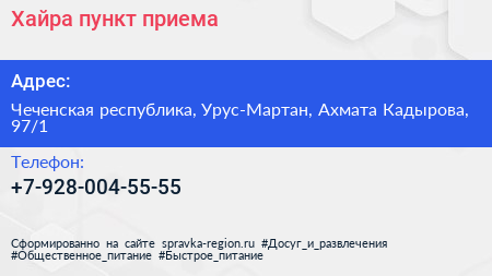 Хайра, пункт приема по адресу Чеченская республика, Урус-Мартан, Ахмата Кадырова, 97/1 в дальнейшем Организация, размещена в следующих категориях:
