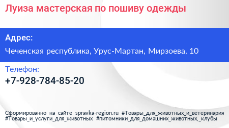 Луиза, мастерская по пошиву одежды по адресу Чеченская республика, Урус-Мартан, Мирзоева, 10 в дальнейшем Организация, размещена в следующих категориях: