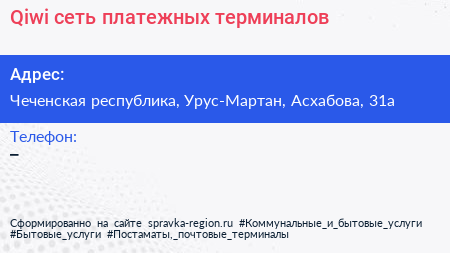 Qiwi, сеть платежных терминалов по адресу Чеченская республика, Урус-Мартан, Асхабова, 31а в дальнейшем Организация, размещена в следующих категориях: