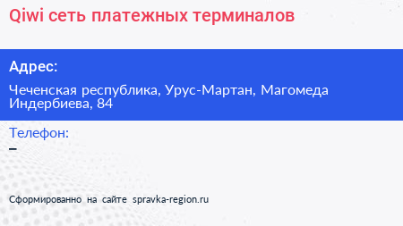 Qiwi, сеть платежных терминалов по адресу Чеченская республика, Урус-Мартан, Магомеда Индербиева, 84 в дальнейшем Организация, размещена в следующих категориях: