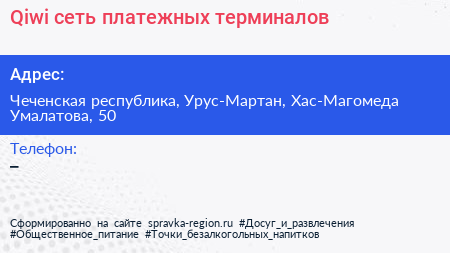 Qiwi, сеть платежных терминалов по адресу Чеченская республика, Урус-Мартан, Хас-Магомеда Умалатова, 50 в дальнейшем Организация, размещена в следующих категориях: