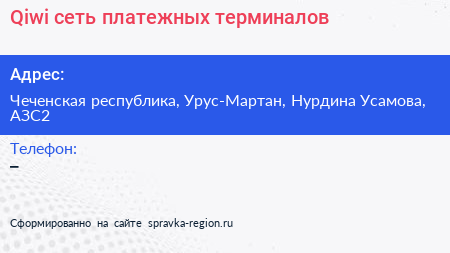 Qiwi, сеть платежных терминалов по адресу Чеченская республика, Урус-Мартан, Нурдина Усамова, АЗС2 в дальнейшем Организация, размещена в следующих категориях: