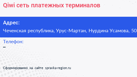 Qiwi, сеть платежных терминалов по адресу Чеченская республика, Урус-Мартан, Нурдина Усамова, 50 в дальнейшем Организация, размещена в следующих категориях: