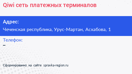 Qiwi, сеть платежных терминалов по адресу Чеченская республика, Урус-Мартан, Асхабова, 1 в дальнейшем Организация, размещена в следующих категориях: