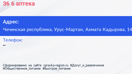 36.6, аптека по адресу Чеченская республика, Урус-Мартан, Ахмата Кадырова, 14 в дальнейшем Организация, размещена в следующих категориях: