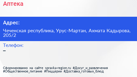Аптека по адресу Чеченская республика, Урус-Мартан, Ахмата Кадырова, 205/2 в дальнейшем Организация, размещена в следующих категориях: