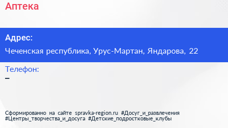 Аптека по адресу Чеченская республика, Урус-Мартан, Яндарова, 22 в дальнейшем Организация, размещена в следующих категориях: