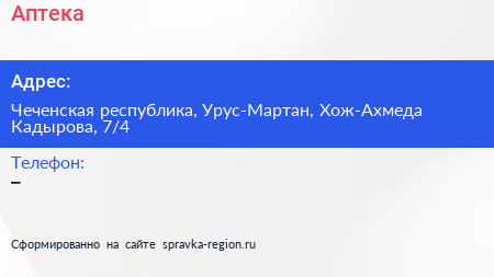Аптека по адресу Чеченская республика, Урус-Мартан, Хож-Ахмеда Кадырова, 7/4 в дальнейшем Организация, размещена в следующих категориях: