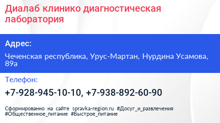 Диалаб, клинико-диагностическая лаборатория по адресу Чеченская республика, Урус-Мартан, Нурдина Усамова, 89а в дальнейшем Организация, размещена в следующих категориях: