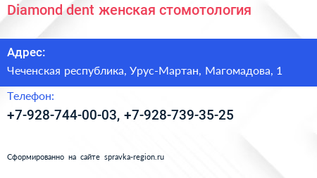 Diamond dent, женская стомотология по адресу Чеченская республика, Урус-Мартан, Магомадова, 1 в дальнейшем Организация, размещена в следующих категориях: