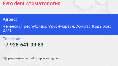 Evro-dent, стоматология по адресу Чеченская республика, Урус-Мартан, Ахмата Кадырова, 27/1 в дальнейшем Организация, размещена в следующих категориях: