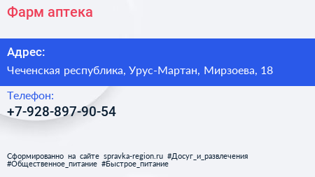 Фарм, аптека по адресу Чеченская республика, Урус-Мартан, Мирзоева, 18 в дальнейшем Организация, размещена в следующих категориях: