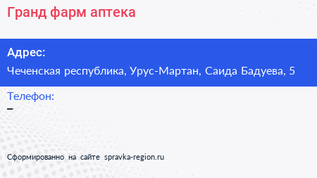 Гранд фарм, аптека по адресу Чеченская республика, Урус-Мартан, Саида Бадуева, 5 в дальнейшем Организация, размещена в следующих категориях: