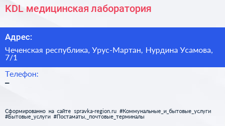 KDL, медицинская лаборатория по адресу Чеченская республика, Урус-Мартан, Нурдина Усамова, 7/1 в дальнейшем Организация, размещена в следующих категориях: