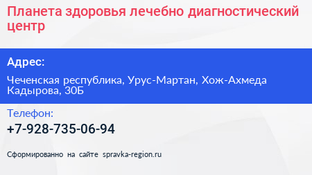 Планета здоровья, лечебно-диагностический центр по адресу Чеченская республика, Урус-Мартан, Хож-Ахмеда Кадырова, 30Б в дальнейшем Организация, размещена в следующих категориях: