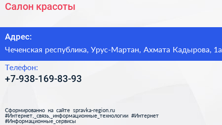 Салон красоты по адресу Чеченская республика, Урус-Мартан, Ахмата Кадырова, 1а в дальнейшем Организация, размещена в следующих категориях: