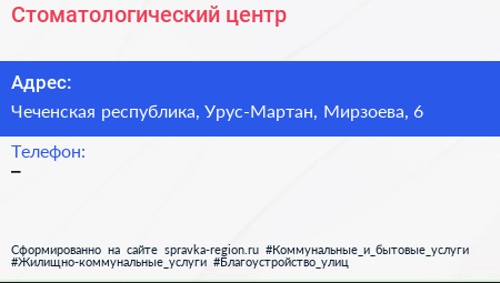 Стоматологический центр по адресу Чеченская республика, Урус-Мартан, Мирзоева, 6 в дальнейшем Организация, размещена в следующих категориях: