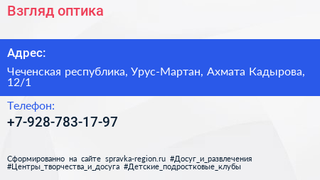 Взгляд, оптика по адресу Чеченская республика, Урус-Мартан, Ахмата Кадырова, 12/1 в дальнейшем Организация, размещена в следующих категориях: