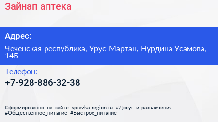 Зайнап, аптека по адресу Чеченская республика, Урус-Мартан, Нурдина Усамова, 14Б в дальнейшем Организация, размещена в следующих категориях: