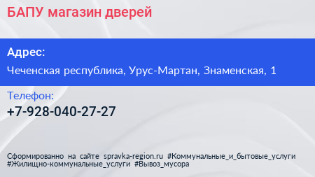 БАПУ, магазин дверей по адресу Чеченская республика, Урус-Мартан, Знаменская, 1 в дальнейшем Организация, размещена в следующих категориях: