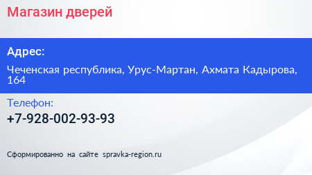 Магазин дверей по адресу Чеченская республика, Урус-Мартан, Ахмата Кадырова, 164 в дальнейшем Организация, размещена в следующих категориях: