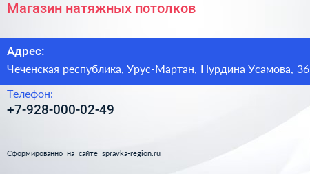 Магазин натяжных потолков по адресу Чеченская республика, Урус-Мартан, Нурдина Усамова, 36 в дальнейшем Организация, размещена в следующих категориях: