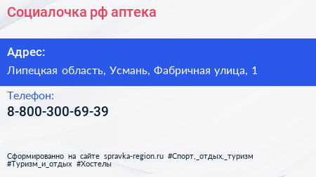 Социалочка.рф, аптека по адресу Липецкая область, Усмань, Фабричная улица, 1 в дальнейшем Организация, размещена в следующих категориях: