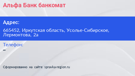 Альфа-Банк, банкомат по адресу 665452, Иркутская область, Усолье-Сибирское, Лермонтова, 2а в дальнейшем Организация, размещена в следующих категориях: