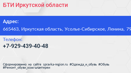 БТИ Иркутской области по адресу 665463, Иркутская область, Усолье-Сибирское, Ленина, 79 в дальнейшем Организация, размещена в следующих категориях: