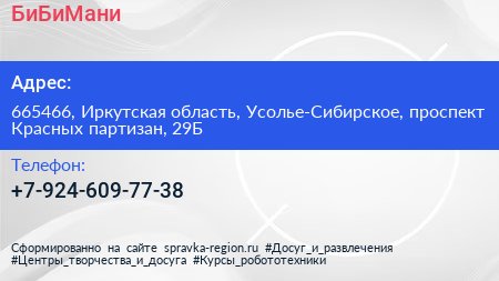 БиБиМани по адресу 665466, Иркутская область, Усолье-Сибирское, проспект Красных партизан, 29Б в дальнейшем Организация, размещена в следующих категориях: