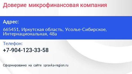 Доверие, микрофинансовая компания по адресу 665451, Иркутская область, Усолье-Сибирское, Интернациональная, 48а в дальнейшем Организация, размещена в следующих категориях: