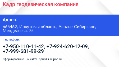 Кадр, геодезическая компания по адресу 665462, Иркутская область, Усолье-Сибирское, Менделеева, 75 в дальнейшем Организация, размещена в следующих категориях: