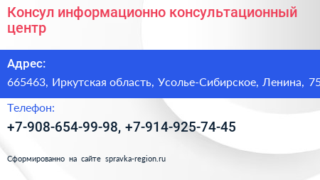 Консул, информационно-консультационный центр по адресу 665463, Иркутская область, Усолье-Сибирское, Ленина, 75 в дальнейшем Организация, размещена в следующих категориях: