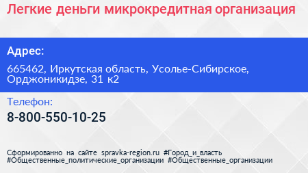 Легкие деньги, микрокредитная организация по адресу 665462, Иркутская область, Усолье-Сибирское, Орджоникидзе, 31 к2 в дальнейшем Организация, размещена в следующих категориях: