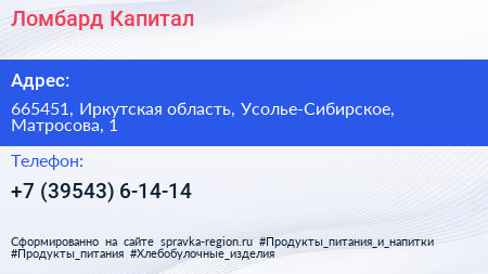 Ломбард Капитал по адресу 665451, Иркутская область, Усолье-Сибирское, Матросова, 1 в дальнейшем Организация, размещена в следующих категориях: