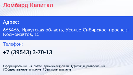Ломбард Капитал по адресу 665466, Иркутская область, Усолье-Сибирское, проспект Космонавтов, 15 в дальнейшем Организация, размещена в следующих категориях: