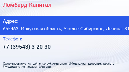 Ломбард Капитал по адресу 665463, Иркутская область, Усолье-Сибирское, Ленина, 81 в дальнейшем Организация, размещена в следующих категориях: