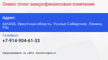 Оникс-плюс, микрофинансовая компания по адресу 665458, Иркутская область, Усолье-Сибирское, Ленина, 93а в дальнейшем Организация, размещена в следующих категориях: