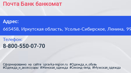 Почта Банк, банкомат по адресу 665458, Иркутская область, Усолье-Сибирское, Ленина, 99 в дальнейшем Организация, размещена в следующих категориях: