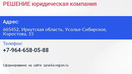 РЕШЕНИЕ, юридическая компания по адресу 665452, Иркутская область, Усолье-Сибирское, Коростова, 15 в дальнейшем Организация, размещена в следующих категориях: