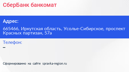 СберБанк, банкомат по адресу 665466, Иркутская область, Усолье-Сибирское, проспект Красных партизан, 57а в дальнейшем Организация, размещена в следующих категориях: