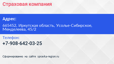 Страховая компания по адресу 665452, Иркутская область, Усолье-Сибирское, Менделеева, 45/2 в дальнейшем Организация, размещена в следующих категориях: