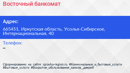 Восточный, банкомат по адресу 665451, Иркутская область, Усолье-Сибирское, Интернациональная, 40 в дальнейшем Организация, размещена в следующих категориях: