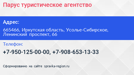 Парус, туристическое агентство по адресу 665466, Иркутская область, Усолье-Сибирское, Ленинский проспект, 66 в дальнейшем Организация, размещена в следующих категориях: