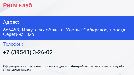Ритм, клуб по адресу 665458, Иркутская область, Усолье-Сибирское, проезд Серегина, 32а в дальнейшем Организация, размещена в следующих категориях: