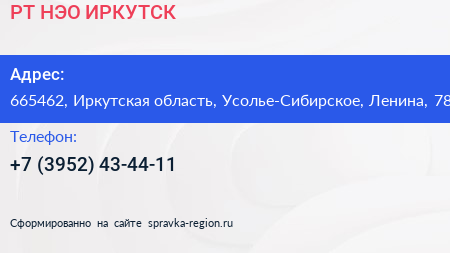 РТ-НЭО ИРКУТСК по адресу 665462, Иркутская область, Усолье-Сибирское, Ленина, 78 в дальнейшем Организация, размещена в следующих категориях: