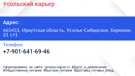 Усольский карьер по адресу 665453, Иркутская область, Усолье-Сибирское, Бережки, 21 ст1 в дальнейшем Организация, размещена в следующих категориях: