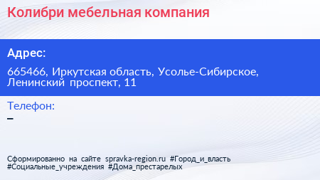 Колибри, мебельная компания по адресу 665466, Иркутская область, Усолье-Сибирское, Ленинский проспект, 11 в дальнейшем Организация, размещена в следующих категориях: