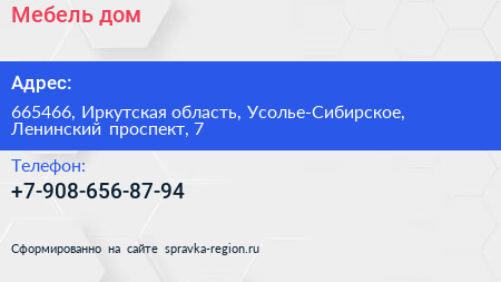 Мебель дом по адресу 665466, Иркутская область, Усолье-Сибирское, Ленинский проспект, 7 в дальнейшем Организация, размещена в следующих категориях: