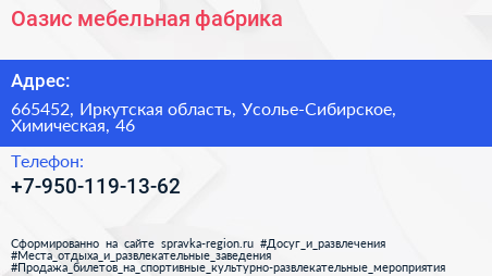 Оазис, мебельная фабрика по адресу 665452, Иркутская область, Усолье-Сибирское, Химическая, 46 в дальнейшем Организация, размещена в следующих категориях: